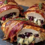 Bacon Cranberry Brie Chicken is a delicious and easy-to-make dish featuring tender chicken breasts stuffed with creamy brie cheese and tangy cranberry sauce, all wrapped in crispy bacon.