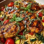 Slice the rested chicken and arrange it on top of the orzo mixture. Don’t forget a generous sprinkle of Parmesan cheese to finish it off. If you want to jazz it up a bit, top with fresh basil leaves for an aromatic touch. It’s ready to be served warm and enjoyed with loved ones—your Balsamic Chicken & Veggie Orzo is complete!