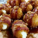 Crispy Bacon Mozzarella Poppers are irresistibly delicious appetizers featuring creamy mozzarella balls wrapped in crispy bacon and coated in panko breadcrumbs, served with a sweet and savory maple glaze.