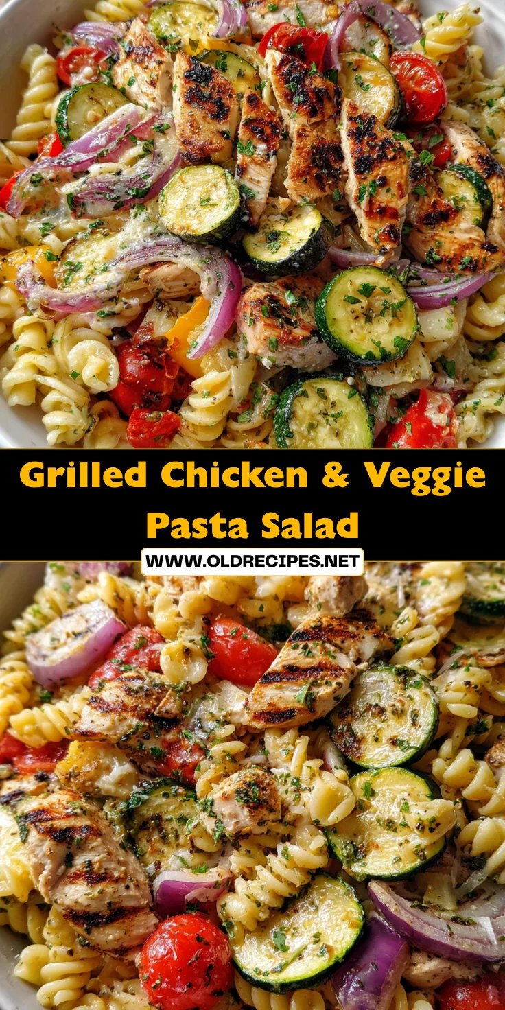 A fresh and delicious grilled chicken and veggie pasta salad, perfect for a light meal or side dish.
