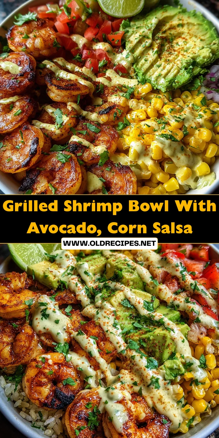 A delicious and flavorful Grilled Shrimp Bowl topped with fresh avocado, corn salsa, and a creamy garlic sauce, perfect for a healthy meal.