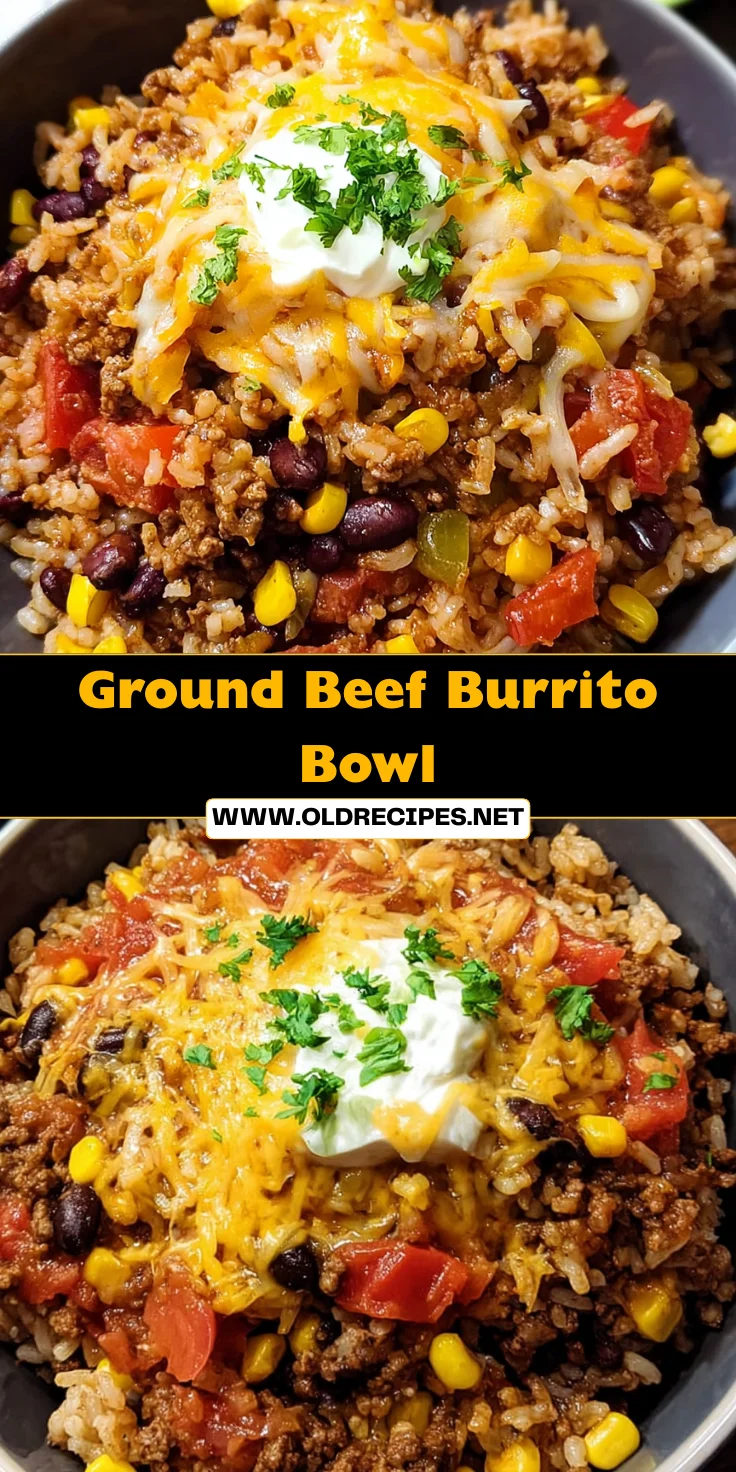 A delicious and savory Ground Beef Burrito Bowl made with rice, beans, and topped with melted cheddar cheese.