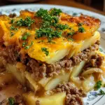 Time for the fun part! Lightly grease a 9×13 inch baking dish. Start with half of your sliced potatoes, layering them on the bottom like a warm, cozy blanket. Next, sprinkle half of the cooked ground beef mixture and pour half of the creamy sauce over that. Repeat the layers with the remaining ingredients. This builds flavor and ensures every bite is a delight!