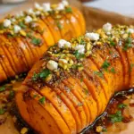 Hasselback Butternut Maple Mustard is a deliciously flavorful dish that combines roasted butternut squash with a sweet and tangy glaze, topped with pistachios, vegan feta, and fresh parsley.