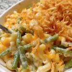 A comforting casserole delight featuring macaroni noodles, creamy cheddar cheese sauce, green beans, and a crispy topping.