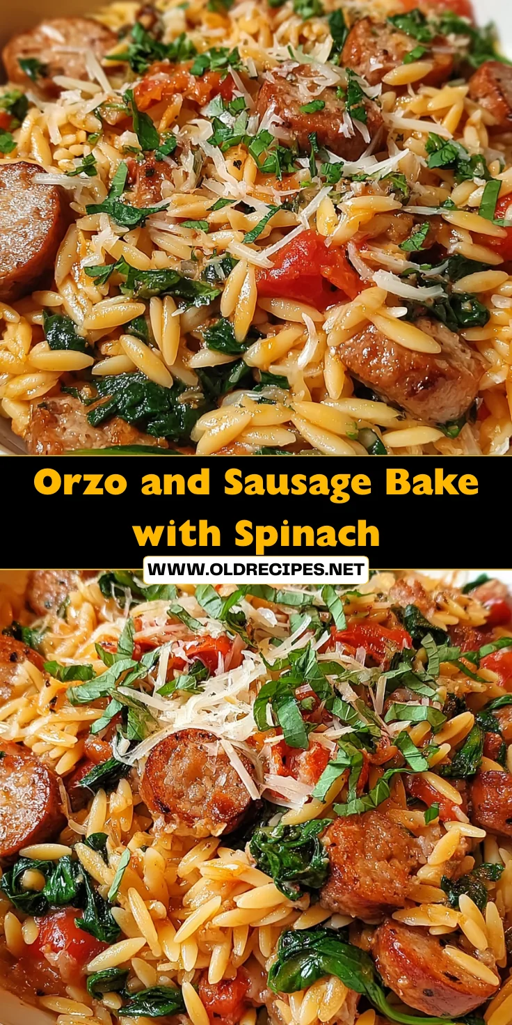 A delicious and easy to prepare Orzo and Sausage Bake with Spinach, perfect for a hearty meal.