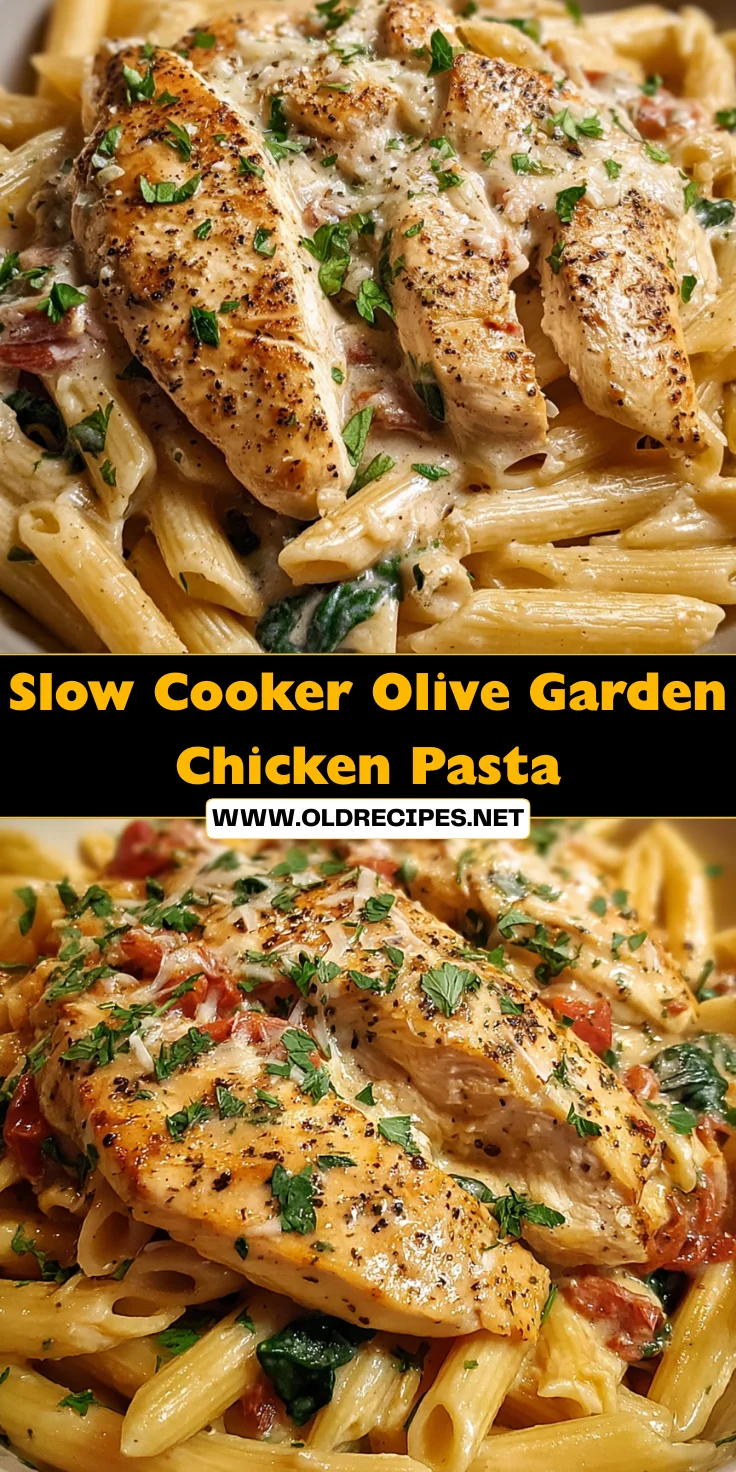 Slow Cooker Olive Garden Chicken Pasta is a creamy and flavorful dish that combines tender shredded chicken, pasta, and spinach in a rich sauce.