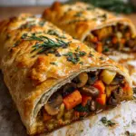 - Slice the veggie Wellington into thick pieces, revealing the colorful, layered filling inside. Serve warm and enjoy the hearty, festive flavors.