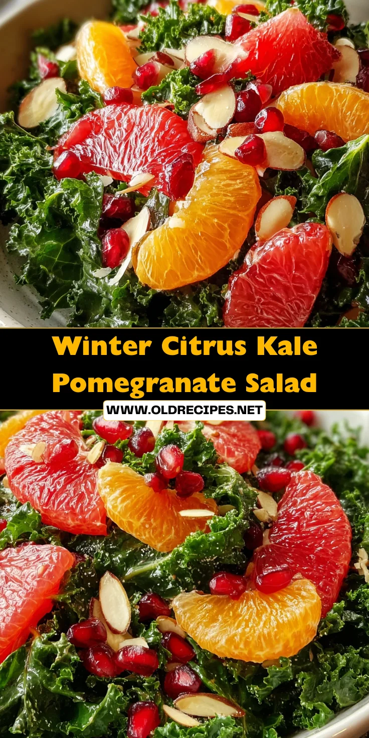 A refreshing and vibrant winter salad featuring kale, citrus fruits, and pomegranate, topped with crispy almonds.